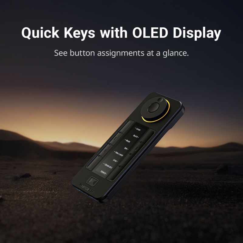 6.為了提高工作效率,它配備了Xencelabs快捷鍵遙控器,帶有OLED顯示屏和物理錶盤。允許每個應用程序最多40個快捷鍵功能。旋鈕有4種模式縮放,旋轉,畫筆大小,和其他功能。