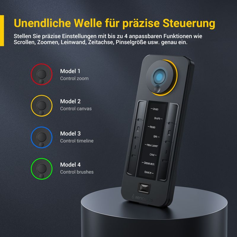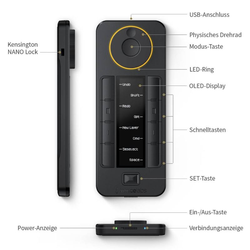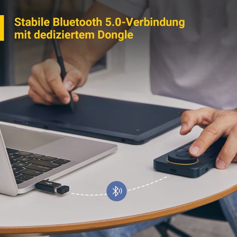 Das programmierbare physikalische Einstellrad blättert durch bis zu 40 Verknüpfungen pro Anwendung mit bestimmten Funktionen wie Zoom, Pinselgröße und Ebenen usw. Sie können auch schnell zwischen Schlüsselgruppen innerhalb einer Anwendung wechseln (z. B. Skizzieren, Färben und Bearbeiten), indem Sie die Schaltfläche „Einstellen“ der Fernbedienung drücken. Über das OLED-Display der Fernbedienung können Sie sich leicht merken, welche Tasten welcher Verknüpfung zugewiesen sind, und der programmierbare Farbring zeigt an, welche Funktion Sie gerade verwenden. Der einstellbare Sleep-Timer sorgt dafür, dass Ihre Fernbedienung während der Arbeit eingeschaltet bleibt. Die Quick Keys-Fernbedienung wurde für Komfort entwickelt, den die drahtlose Verbindung ermöglicht, indem sie dem Künstler die Freiheit gibt, die Fernbedienung in vier verschiedenen Ausrichtungen zu positionieren, um Ihren Vorlieben am besten zu entsprechen.