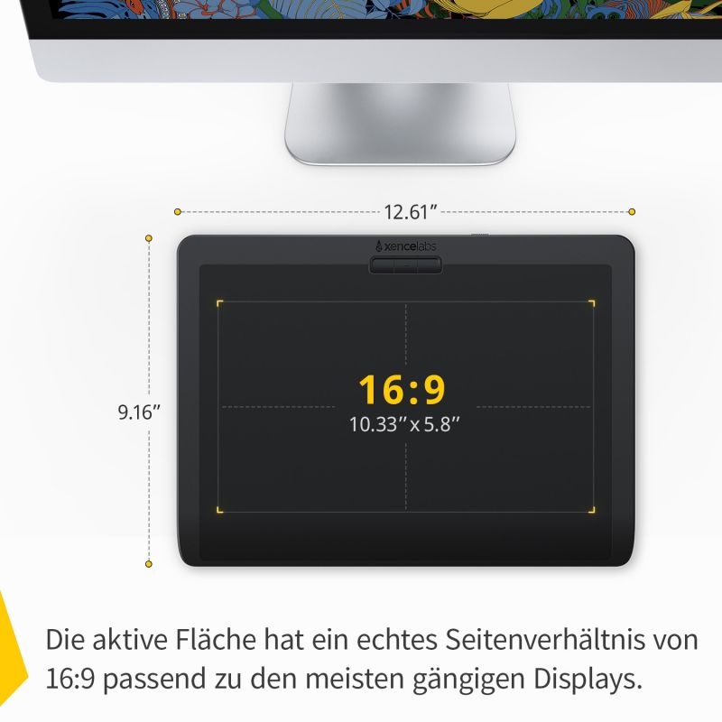 Die aktive Fläche beträgt 26,2 x 14,7 cm. Das Seitenverhältnis 16:9 ist eine gute Größe, um mit den meisten Monitorgrößen zusammenzuarbeiten, von kleinen bis zu größeren 27-Zoll-Monitoren.