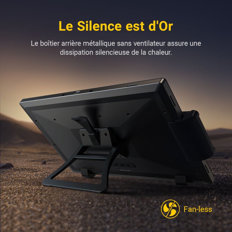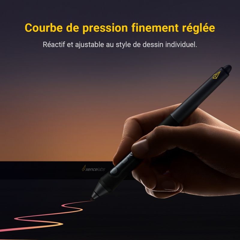 Courbe de pression optimisée: 8192 niveaux de sensibilité, force d’activation initiale de 3 g et inclinaison ±60° pour un tracé précis, des lignes fines aux ombrages marqués.
