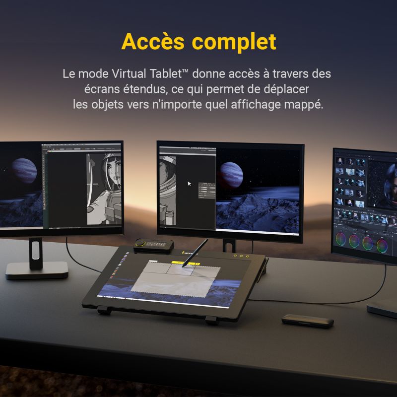 Mode Virtual Tablet™: Contrôlez plusieurs moniteurs comme une seule surface continue avec le stylet Xencelabs v2. Personnalisez la couleur, la transparence, la taille et la position de l’overlay selon votre espace de travail.