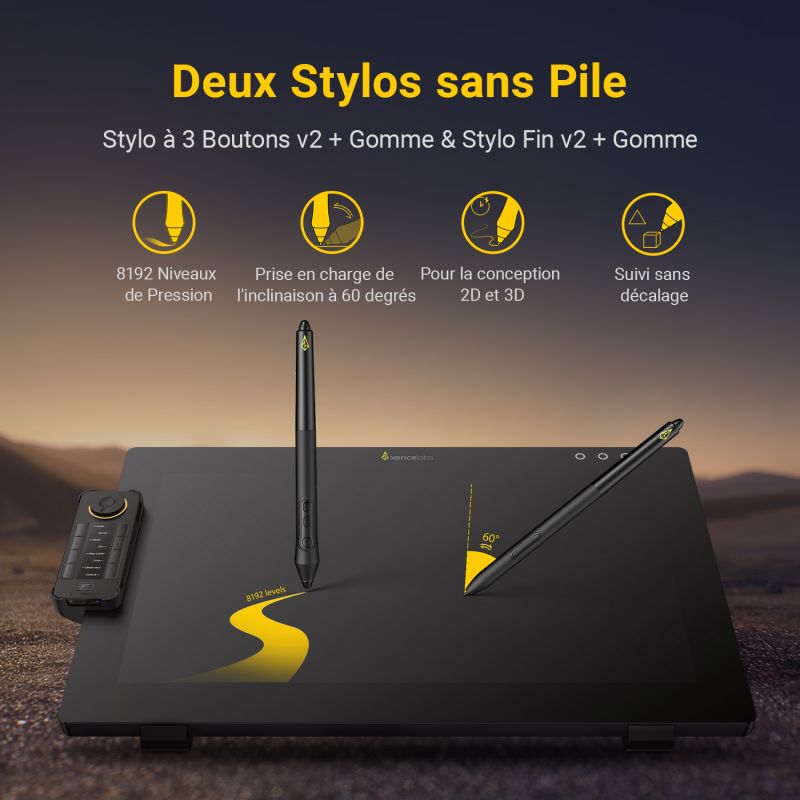 Deux stylets inclus: Le 3 Button Pen v2 et le Thin Pen v2 sont fournis, chacun équipé d’une gomme et de réglages personnalisables par application. Parfait pour différents styles de prise en main et de travail.