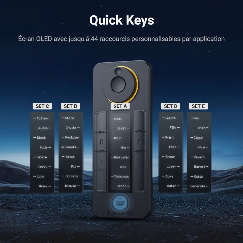 40 boutons personnalisables spécifiques à l'application dans 5 ensembles de 8. Comprend un cadran physique