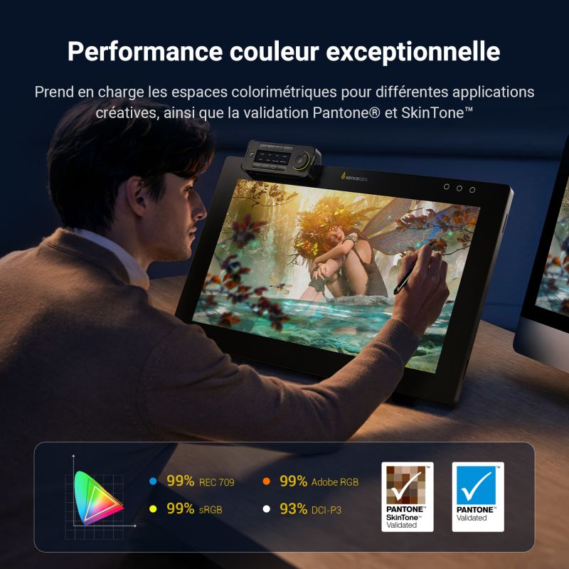 L’écran restitue 1,07 milliard de couleurs avec une couverture de 93 % du DCI-P3, 99 % de l’Adobe RGB et une validation Pantone et SkinTone.