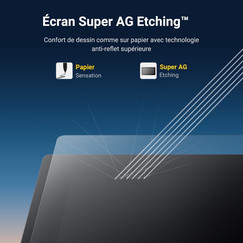 La technologie anti-reflets de l'écran, Super AG Etching™, réduit les reflets pour offrir une vision claire et sans distraction, même dans des pièces très éclairées ou avec des lumières au plafond, et sans effets brillants qui distraient ou fatiguent les yeux.