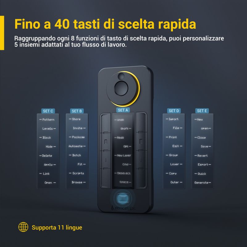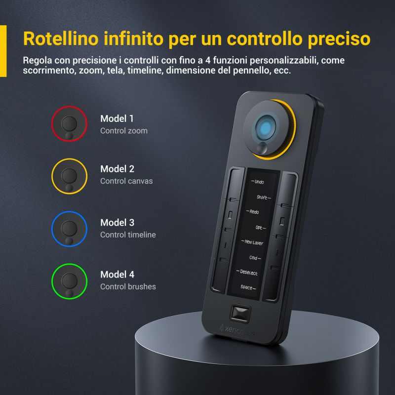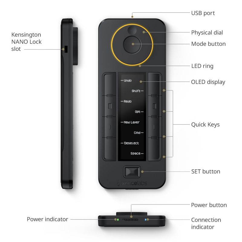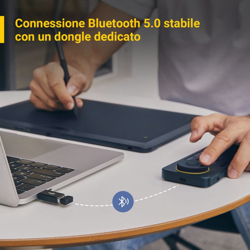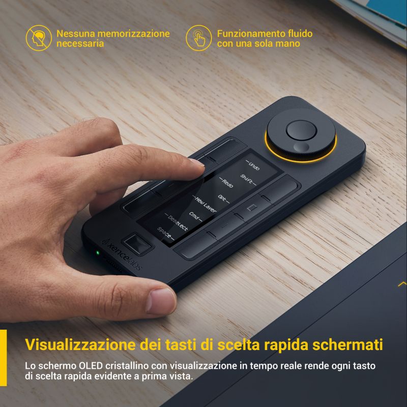 La combinazione tra tasti fisici e il display OLED permette di personalizzare fino a 40 scorciatoie per con funzioni specifiche come zoom, dimensione del pennello, livelli, ecc. Puoi anche passare rapidamente da un gruppo di tasti ad un altro (come disegnare, colorare e modificare ) digitando il pulsante “Set” del telecomando. Il display OLED del telecomando rende facile ricordare quali tasti sono assegnati a quale scorciatoia e l’anello colorato programmabile indica quale funzione stai utilizzando in quel momento. Il timer di spegnimento regolabile assicura che il telecomando rimanga acceso mentre lavori. Il telecomando Quick Keys è stato progettato per il comfort che la connessione wireless consente permettendo all’artista la libertà di posizionare il telecomando in quattro diversi orientamenti per un adattamento perfetto alle proprie esigenze.