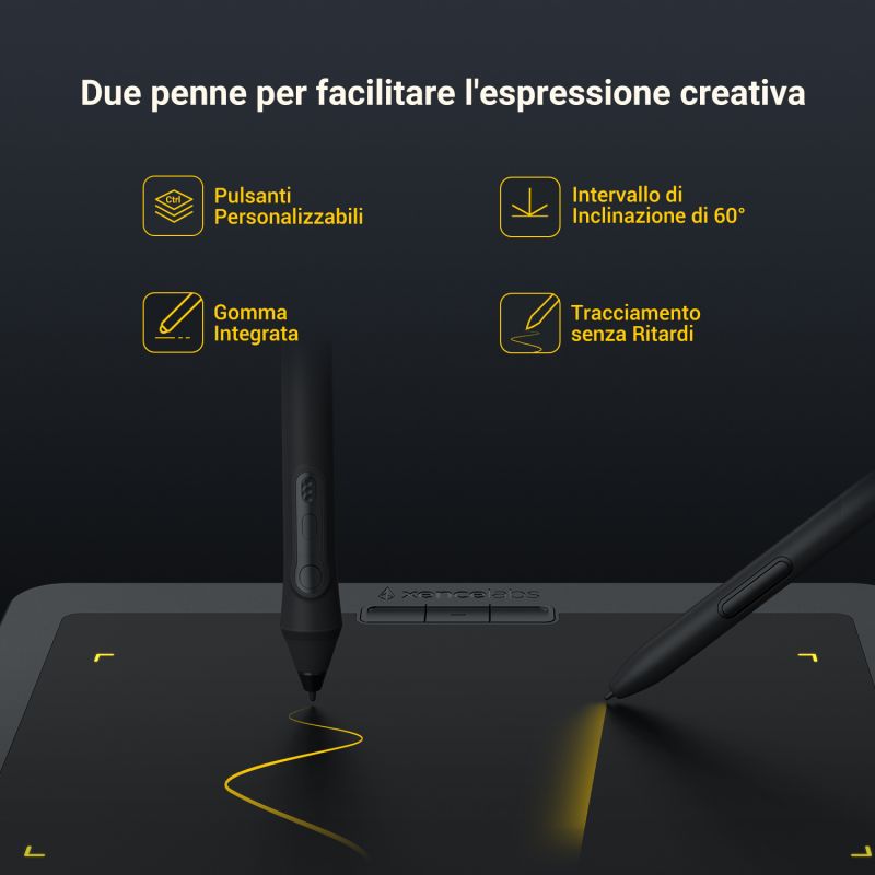 Tutte le nostre tavolette sono dotate di due penne di differente diametro, entrambe perfettamente personalizzabili per il proprio flusso di lavoro. La penna più grande con 3 pulsanti possiede tre pulsanti programmabili e una gomma per un accessorio totalmente personalizzabile. La penna più piccola e sottile, che si impugna come una penna o una matita comune, è dotata di due bottoni e una gomma.