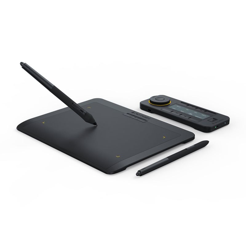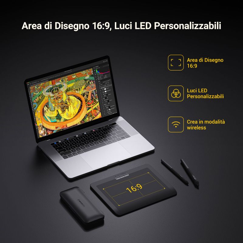 La tavoletta presenta una leggera curvatura utile come poggiapolsi per un comfort ottimale e luci LED regolabili per meglio definire l’area di disegno attiva. L’imgombro ridotto di questa tavoletta è ideale per la creazione di layout grafici o quando le modifiche richiedono l’utilizzo di punti di controllo, maniglie di trasformazione o filtri. Con una superficie di disegno con rapporto d’aspetto 16:9, l’area attiva si adatta perfettamente ai display standard del settore. Nella confezione della Tavoletta Grafica Small sono inclusi una custodia per il trasporto del dispositivo e accessori quali cavo USB, guanto da disegno, custodia per entrambe le penne digitali, chiavetta Bluetooth USB, adattatore, punte, e estrattore punte.