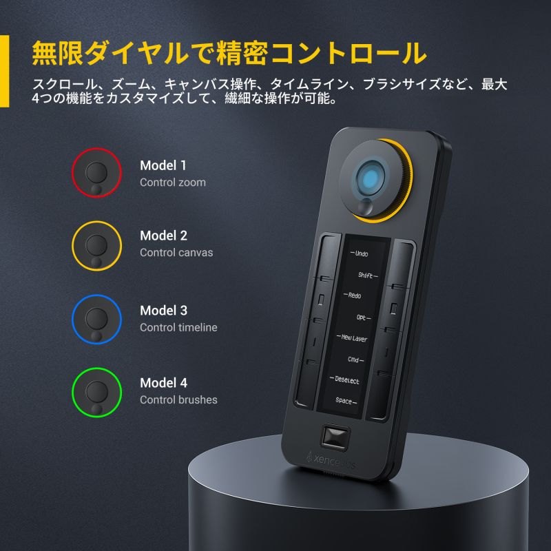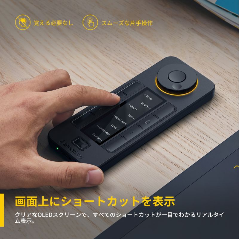 プログラム可能な物理ダイヤルは、ズーム、ブラシサイズ、レイヤーなどの特定の機能を持つアプリケーションごとに最大4つのダイヤルスクロールの割り当てが可能です。また、クイッキーズリモートの「セット」ボタンを押すことで、アプリケーションごとに設定したキーグループ(スケッチ、カラーリング、編集など)を素早く切り替えることができます。クイッキーズリモートの有機ELディスプレイは、どのキーがどのショートカットに割り当てられているかを目視で確認でき、プログラム可能なLEDのカラーリングは、現在使用しているセットを判断するのに役立ちます。オフから120分まで時間調整可能なスリープタイマーも搭載しています。クイッキーズリモートは、ワイヤレスで接続するメリットを活かしてアーティストが好みに合わせて4つの方向にリモートを配置できるるよう設計されています。