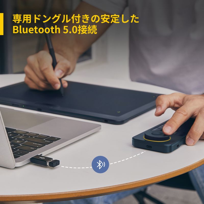 専用のBluetooth接続(通常のBluetoothとは異なります)に対応しており、パッケージに専用のBluetoothレシーバーが同梱されています。開封後すぐに使え、安定したレスポンスを実現します。レシーバーのない環境ではUSB-Cの有線接続をご利用ください。