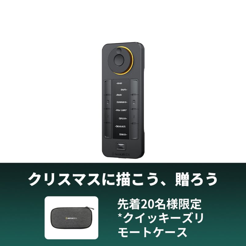 プログラム可能な物理ダイヤルは、ズーム、ブラシサイズ、レイヤーなどの特定の機能を持つアプリケーションごとに最大4つのダイヤルスクロールの割り当てが可能です。また、クイッキーズリモートの「セット」ボタンを押すことで、アプリケーションごとに設定したキーグループ(スケッチ、カラーリング、編集など)を素早く切り替えることができます。クイッキーズリモートの有機ELディスプレイは、どのキーがどのショートカットに割り当てられているかを目視で確認でき、プログラム可能なLEDのカラーリングは、現在使用しているセットを判断するのに役立ちます。オフから120分まで時間調整可能なスリープタイマーも搭載しています。クイッキーズリモートは、ワイヤレスで接続するメリットを活かしてアーティストが好みに合わせて4つの方向にリモートを配置できるるよう設計されています。