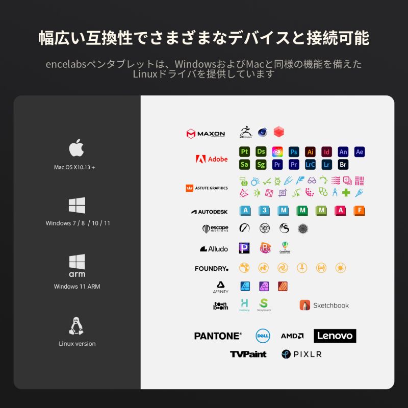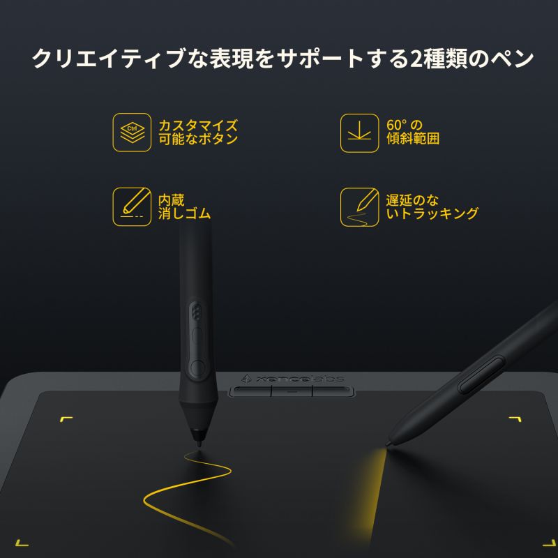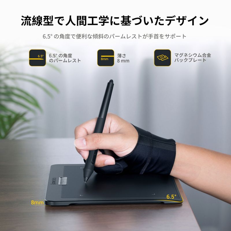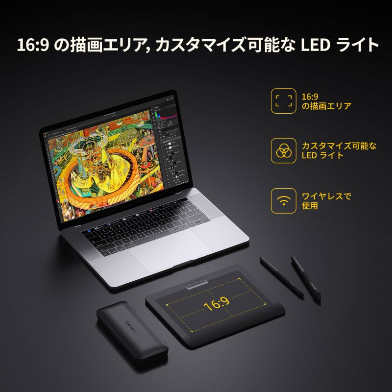 当社のタブレットは、緩やかに傾斜したハンドレストを採用し、ドロー時の快適性を最大限に高めています。また描画面のアスペクト比は 16 : 9 です。これは、箱から出して接続語すぐに、ほとんどの業界標準のモニターに正確にマッピングされることを意味します。つまり、あなたが当社のタブレットで完全な円を描いた場合、画面上でも完全な円を再現することができます。タブレットには、保護用のスリーブキャリングケース、ドローインググローブ、2種類のデジタルペン、ワイヤレスレシーバー、USB変換アダプター、替え芯、および替え芯抽出器、ペンケースが付属しています。