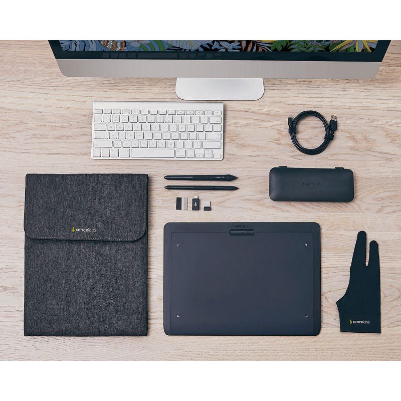 The tablet features a seamless and gently curved palm rest to maximize comfort, as well as adjustable LED lights, which help define the active drawing area. Our drawing surface aspect ratio is 16:9 native. This means it maps exactly to most industry-standard monitors out of the box. So if you were to draw a perfect circle on our tablet, you’d get a perfect circle on the screen. The tablet ships with a protective carrying case for your tablet and all of your accessories including, a drawing glove, and the pen case that contains both digital pens, dongle, adapter, nibs, and nib extractor.