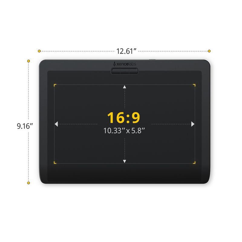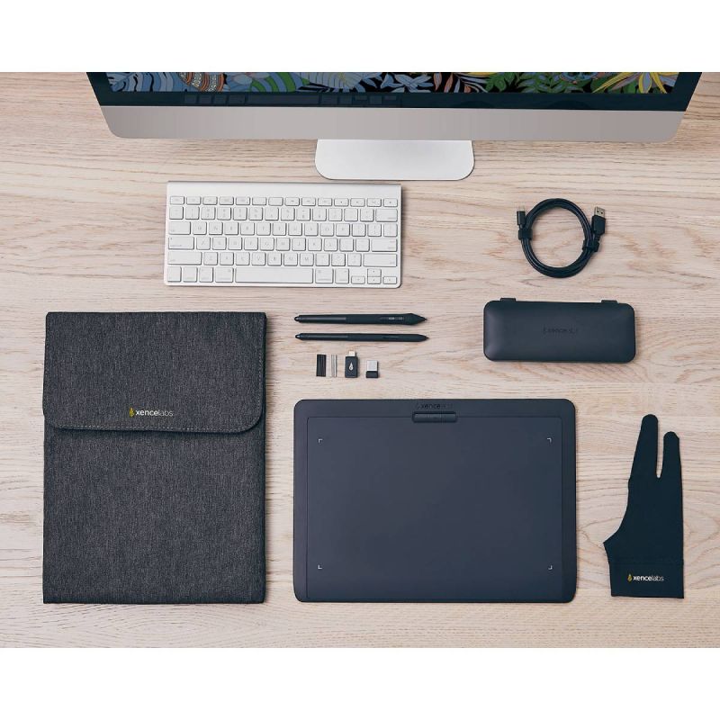 The tablet features a seamless and gently curved palm rest to maximize comfort, as well as adjustable LED lights, which help define the active drawing area. Our drawing surface aspect ratio is 16:9 native. This means it maps exactly to most industry-standard monitors out of the box. So if you were to draw a perfect circle on our tablet, you’d get a perfect circle on the screen. The pen tablet ships with a protective carrying case for your tablet and all of your accessories including, a drawing glove, and the pen case that contains both digital pens, dongle, adapter, nibs, and nib extractor.
