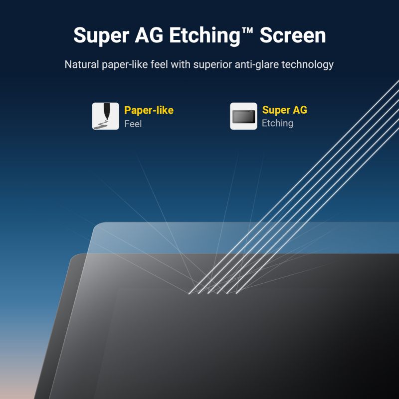 Xencelabs' Super AG Etching Display provides an etched texture for the right amount of friction, giving a pen-and-paper feel. It also has exceptional glare reduction, reducing distracting glare and giving superior clarity in brightly lit environments or rooms with overhead ceiling lights.