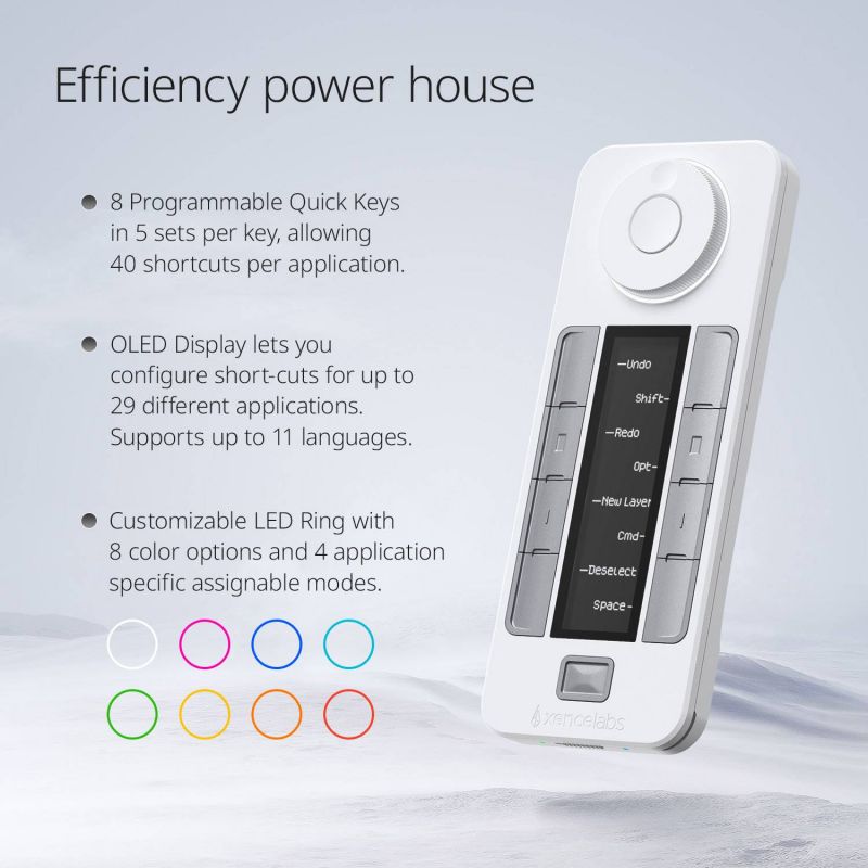 The Xencelabs Quick Keys provide a shortcut controller for left-handed or right-handed, wireless or wired, with 5 sets of 8 keys, that allows up to 40 programmable functions per application.