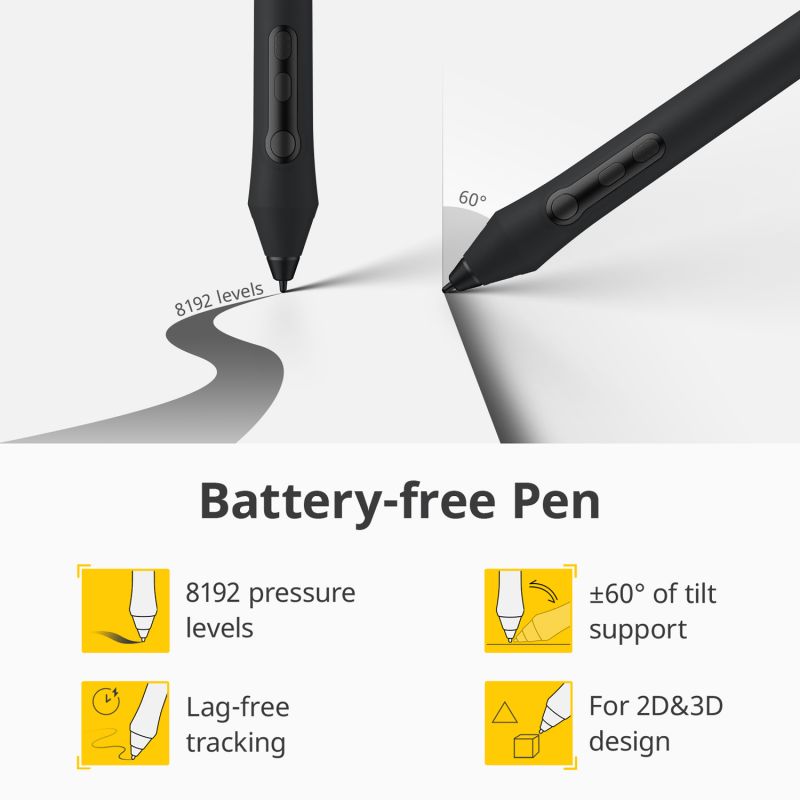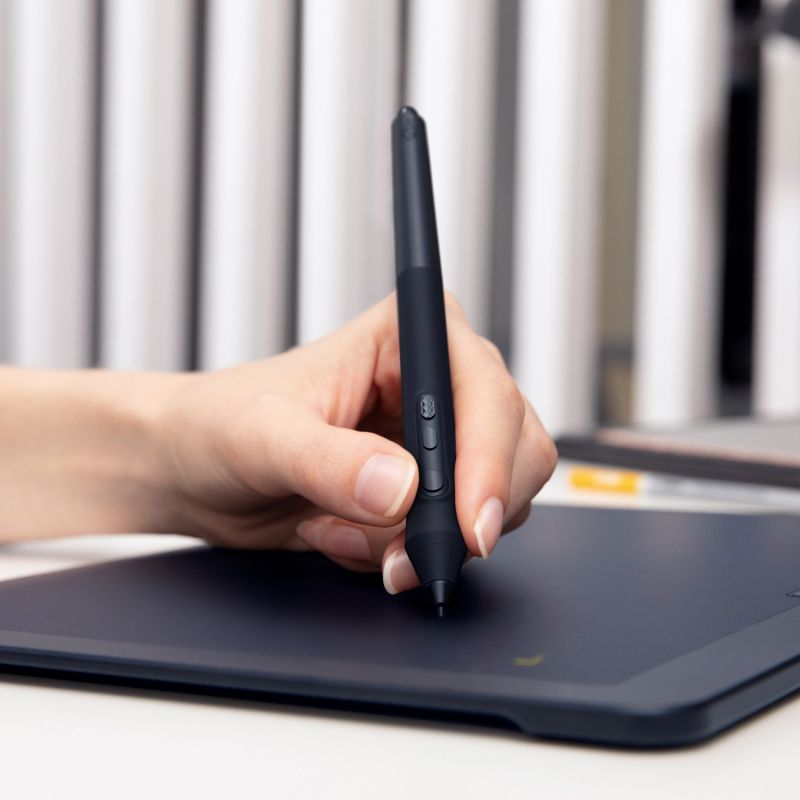 The pen's thicker profile barrel, soft-touch silicone grip, and well-positioned buttons provide a comfortable experience. Great for both 2D and 3D.