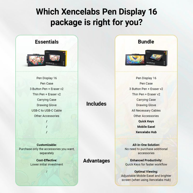 The Pen Display 16 Essentials is designed for artists who need the basics to draw and be quickly mobile. It is designed to work with recent laptops that have USB-C alt-mode and can provide 15W of power. For compatibility with HDMI and DisplayPort plus many other productivity features including enhanced brightness, please consider the more fully featured Pen Display 16.