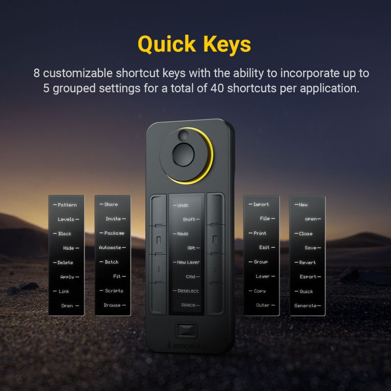 Productivity Quick Keys: Work faster with the Xencelabs Quick Keys remote featuring an OLED display and physical dial with 4 modes. Program up to 40 shortcuts per application.